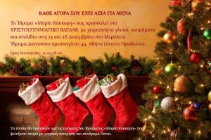 Ελάτε να ψωνίσετε ρούχα, κοσμήματα, αξεσουάρ, διακοσμητικά κι άλλα πολλά σε πολύ χαμηλές τιμές και να ενισχύσετε το έργο μας! Σας περιμένουμε όλους στις 15 και 16 Δεκεμβρίου στο Μερόπειο Ίδρυμα που βρίσκεται στη Διονυσίου Αρεοπαγίτου 45 (έναντι Ηρωδείου) από τις 11:00 ως τις 18:00.